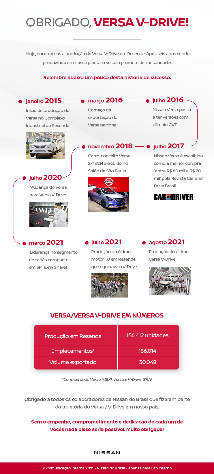 A Nissan decidiu encerrar a fabricação do Versa V-Drive em seu Complexo Industrial de Resende. A decisão faz parte do ciclo natural de vida do produto, que teve muito sucesso no mercado brasileiro. Com isso, a unidade do Sul Fluminense poderá aumentar a sua capacidade de produção do Novo Nissan Kicks, produto mais vendido pela marca no Brasil.