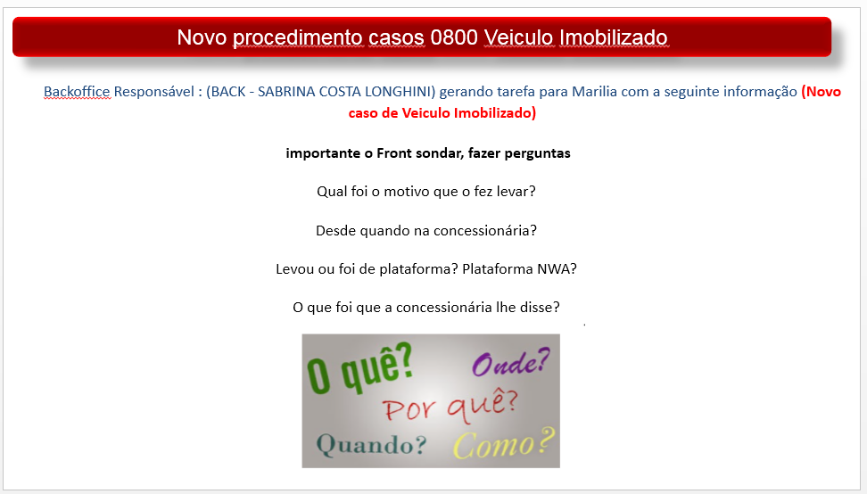 Novo procedimento casos 0800 Veiculo Imobilizado