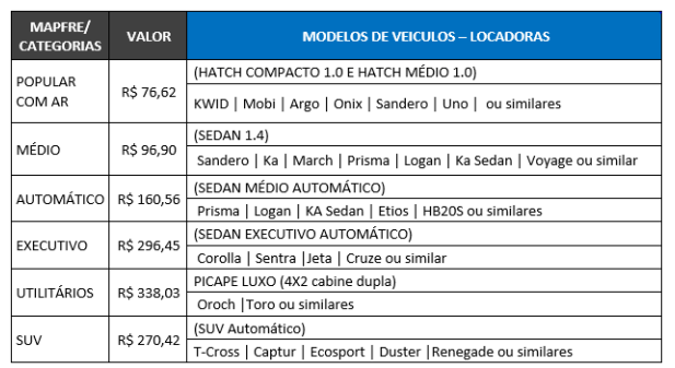 Priorizar a locação pela Localiza e caso não haja disponibilidade solicitar a Mapfre.