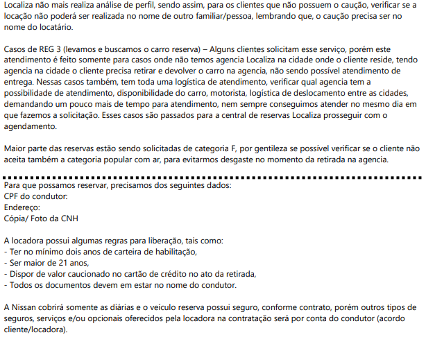 - Caso não haja disponibilidade do porte informado ao cliente já verificar qual o porte tem disponível, em muitos casos teremos que liberar o porte Popular ou médio automático (Localiza está com uma grande indisponibilidade de veículos porte médio na Frota). Sugiro entender com o cliente o melhor porte que lhe atende.