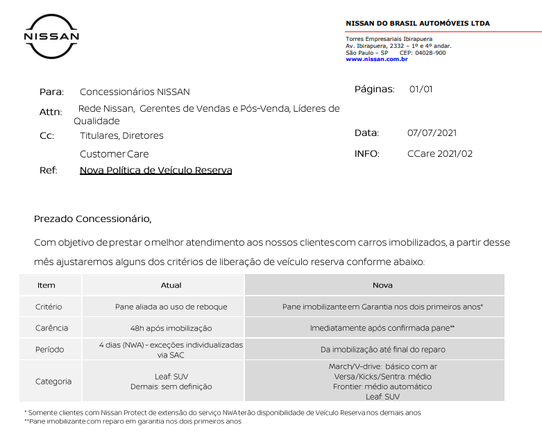 Veículo imobilizado na rede Nissan com baixa quilometragem (até 2.000Km) e problema de produto. (Liberar o VR de imediato).