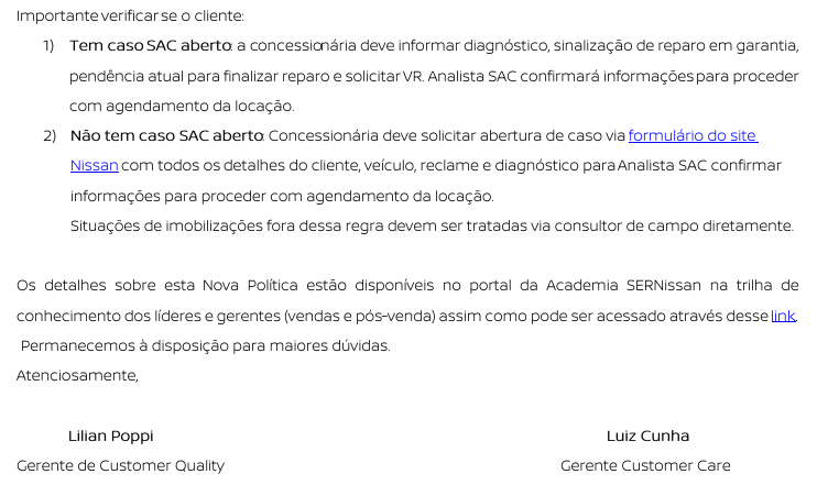 Veículo imobilizado na rede Nissan cujo tempo imobilizado + prazo de entrega da peça seja superior a 30 dias.